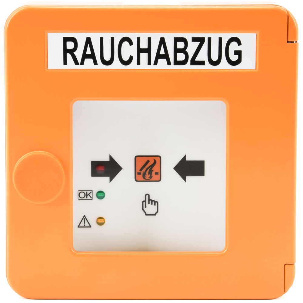 Abschließbares Zink-Druckgussgehäuse, Schutzart IP30, inklusive einem Schlüssel und mit Schriftzug „RAUCHABZUG“